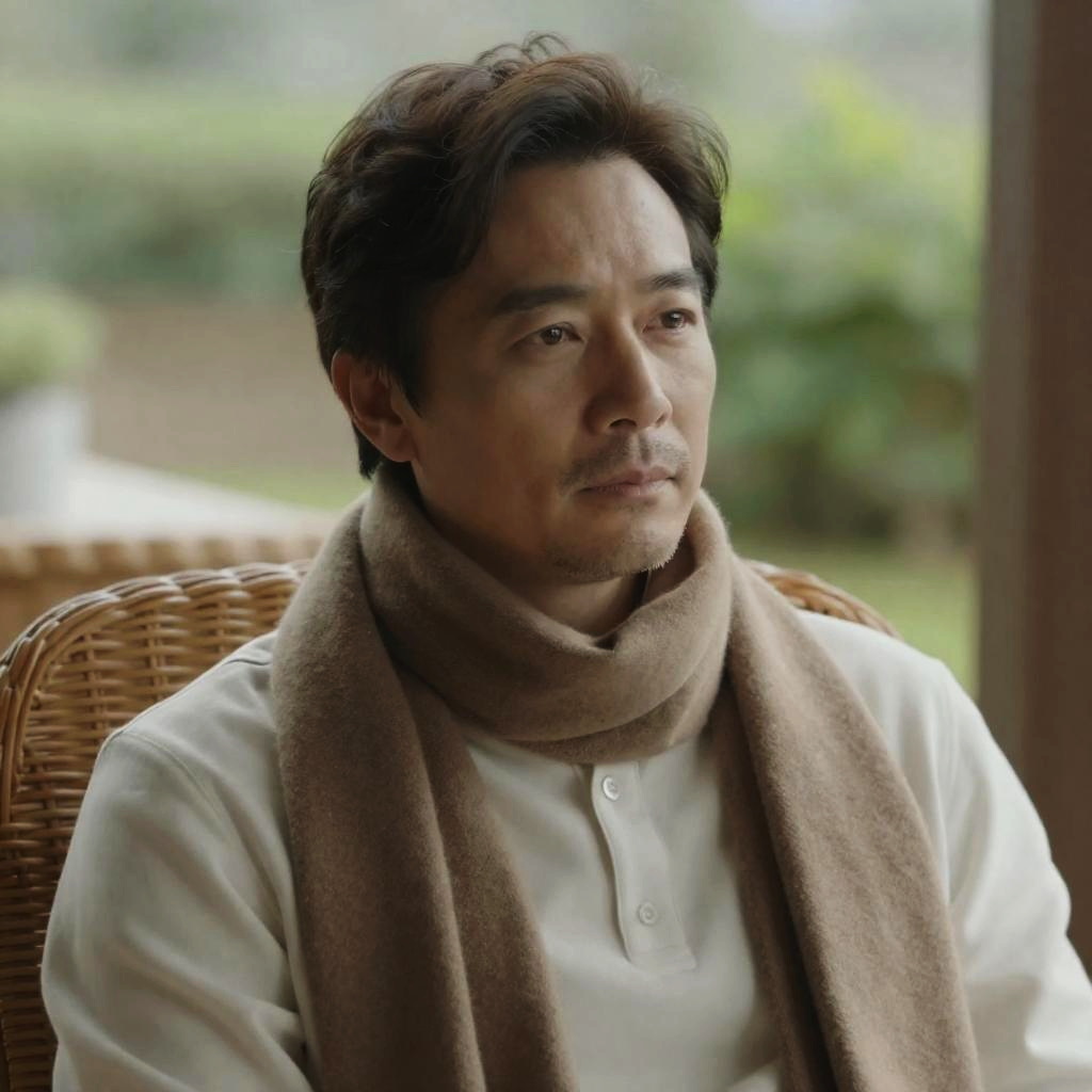 Close-up of an Asian man with dark hair and a mustache, facing left, wearing a light-colored shirt. Dim lighting, blurred dark background. Serious expression, slight frown. Side profile, slightly angled. Single person.