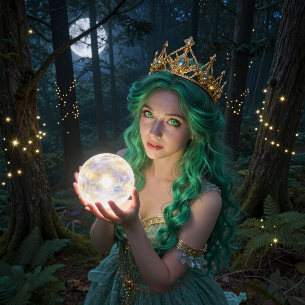 Photograph of a young woman with long, wavy, green hair and fair skin, wearing a golden crown and a sparkly, silver dress with gold trim. She holds a glowing, illuminated orb in her hands, illuminating her green eyes. She stands in a dark, enchanted forest with tall trees and twinkling fairy lights in the background. The moon is partially visible through the trees, adding a mystical atmosphere. Her expression is gentle and ethereal, and her dress has a delicate, fairy-tale-like texture. The image has a magical, fantasy theme.