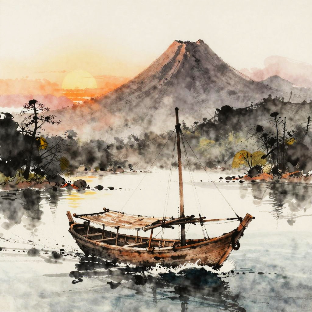 A Tonalism style ink wash painting, illustrating a Javanese jong (large wooden trading vessel) sailing into a volcanic anchorage in the Banda Sea (Spice Islands) at sunset.
