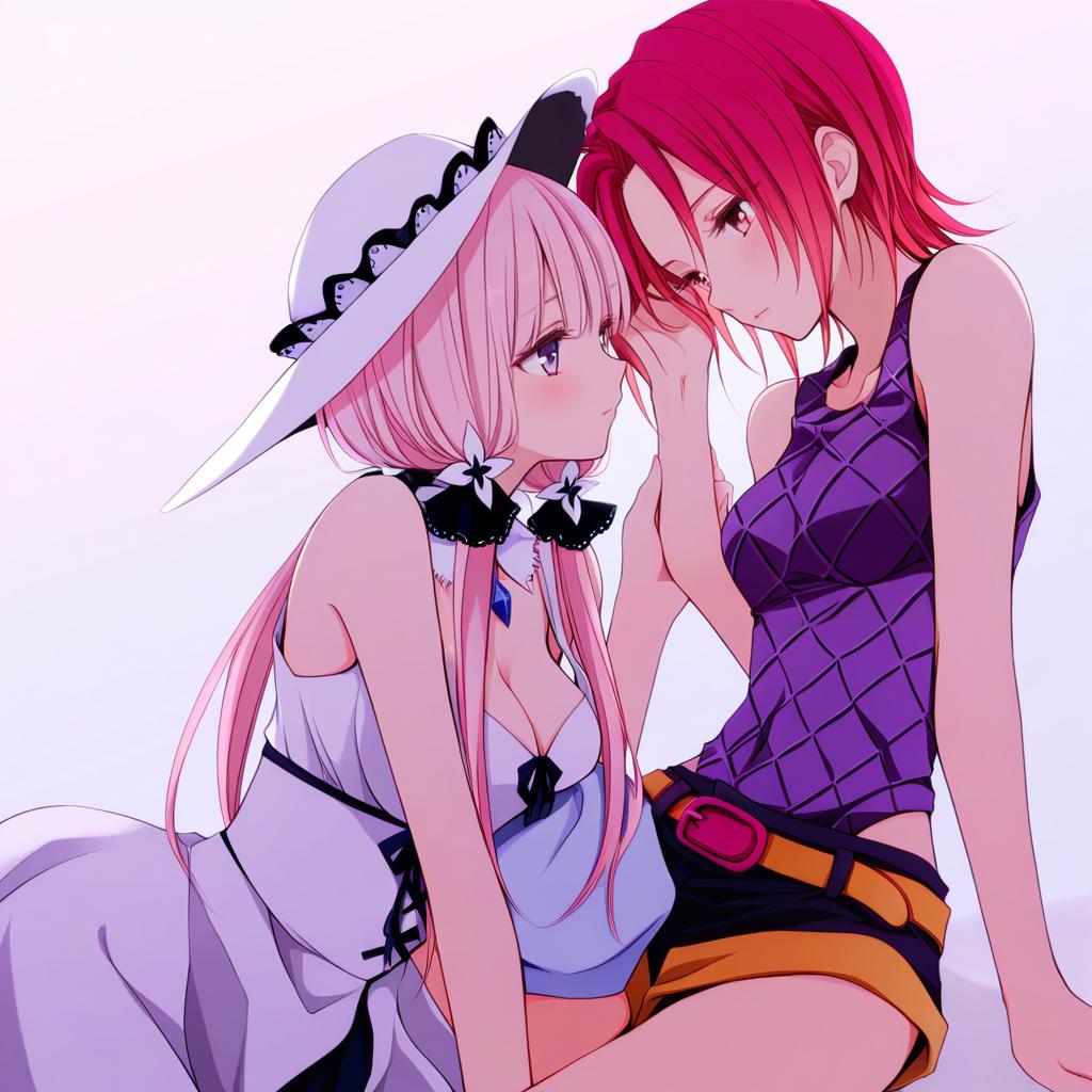 Hot pants (sbr), jojo no kimyou na bouken, 1girl, pink eyes, short hair, pink hair, red hair, hat, by artist takayaki, leet