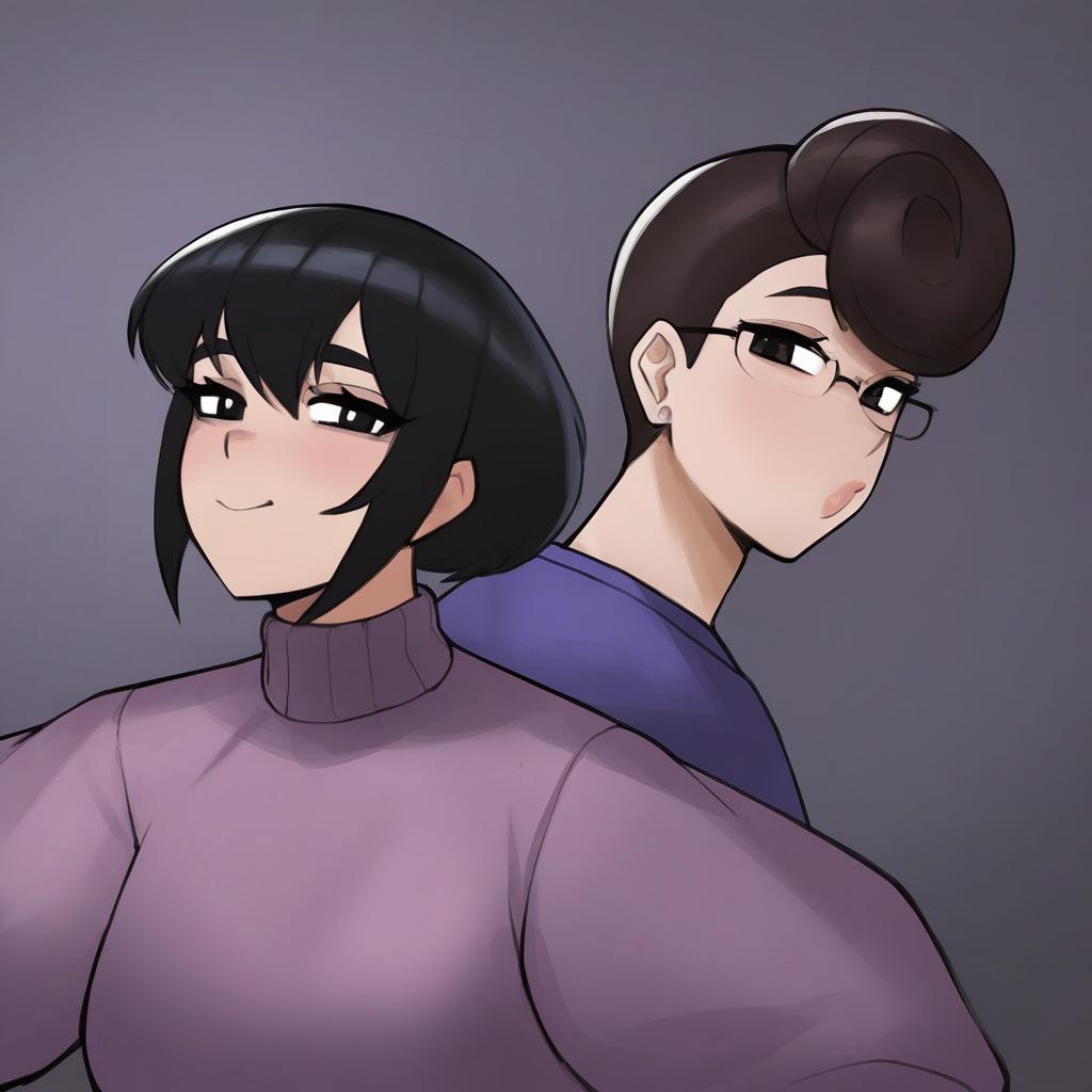 Digital anime-style illustration featuring two characters with distinct hairstyles and expressions. The character in front has short black hair, a smooth complexion, and is wearing a purple turtleneck sweater. The character behind has a stylish pompadour hairstyle, glasses, earrings, and wears a blue top. The background is plain gray, highlighting the characters' features.
