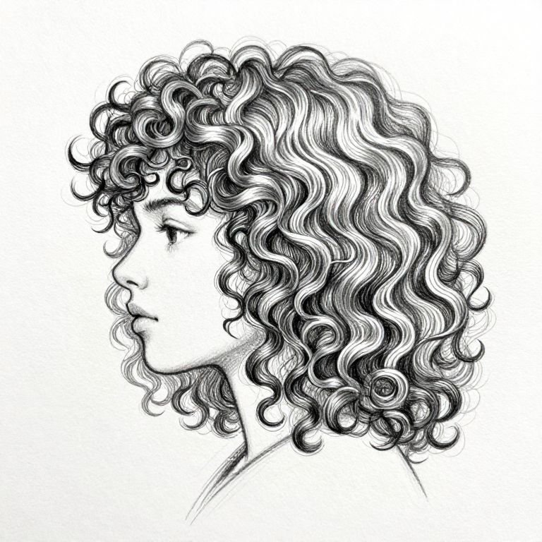 Hair sketch of curly locks with intricate line work, highlighting individual curls and shading variations, monochrome style on textured sketchbook paper, capturing dynamic flow and organic shapes in a realistic yet stylized manner