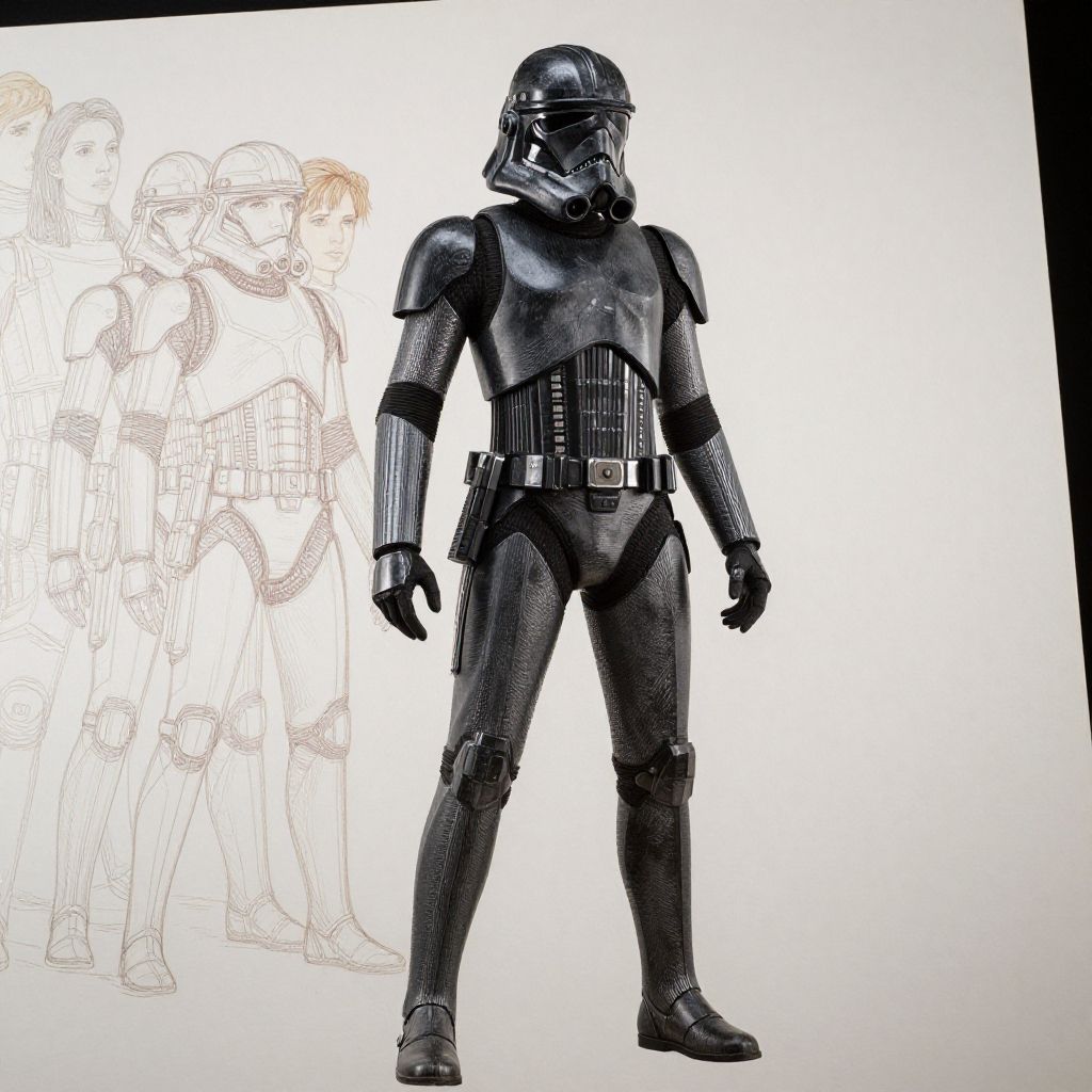 Photograph of a black, detailed, full-body Stormtrooper costume standing in the center. The costume features a glossy helmet with a dark visor, armored chest plate, and segmented armor on the arms, legs, and torso. The belt has a utility pouch and a rectangular buckle. In the background, there's a monochromatic, lightly sketched drawing of multiple Stormtroopers standing together, created in pencil. The sketch is partially visible, with faint outlines and minimal shading. The background is white, contrasting sharply with the black costume and pencil sketch. The image combines photographic realism with hand-drawn illustration elements.