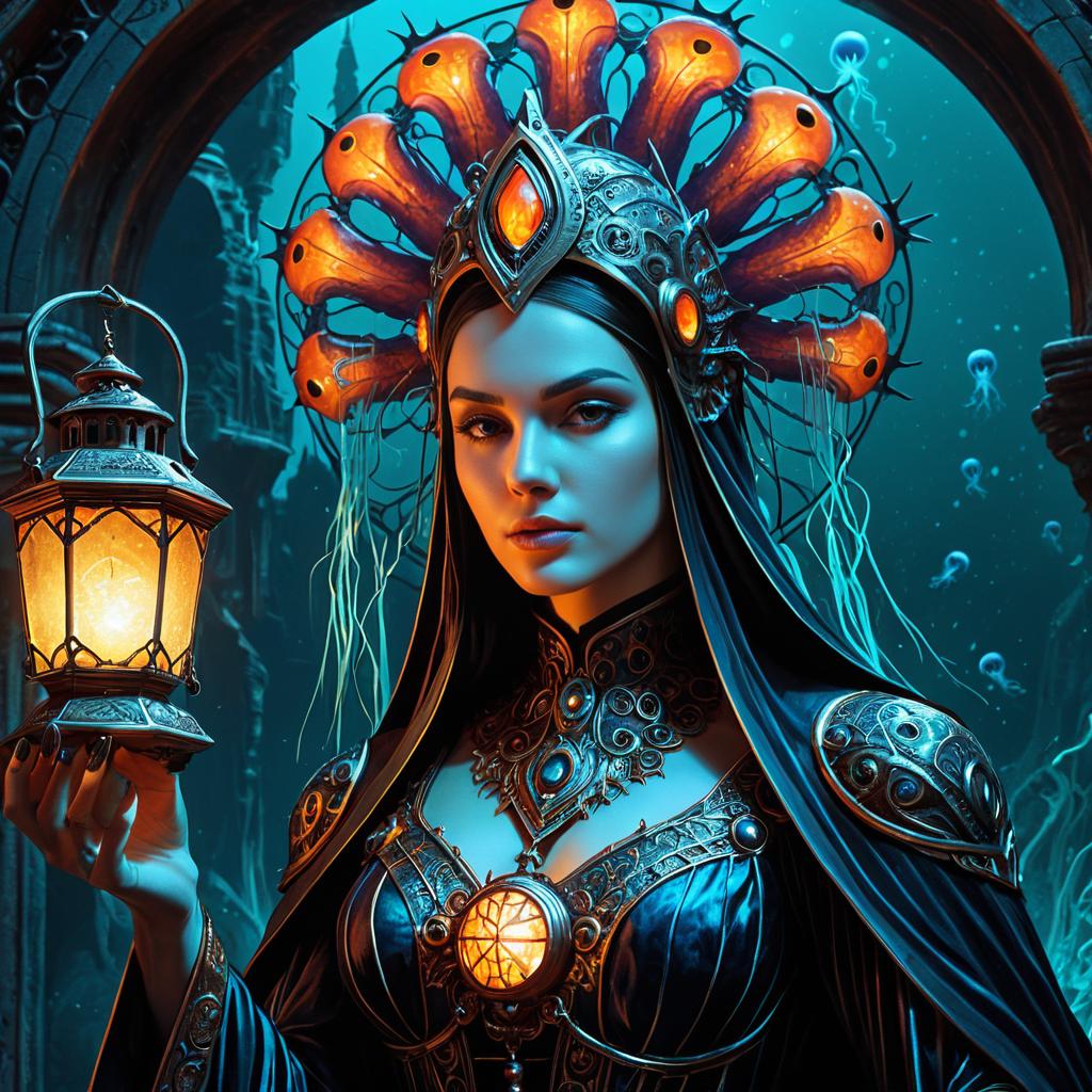 Very colorful image of a snowy mountain, nature guardian with wind-blown hair, power-generating jellyfish, artwork by Ansel Adams, hyperdetailed, realistic, smooth polished porcelain, beautiful ice goddess, vibrant, ornate metal gothic icon, heavy patina, joy, ultrasharp, photorealistic octane render