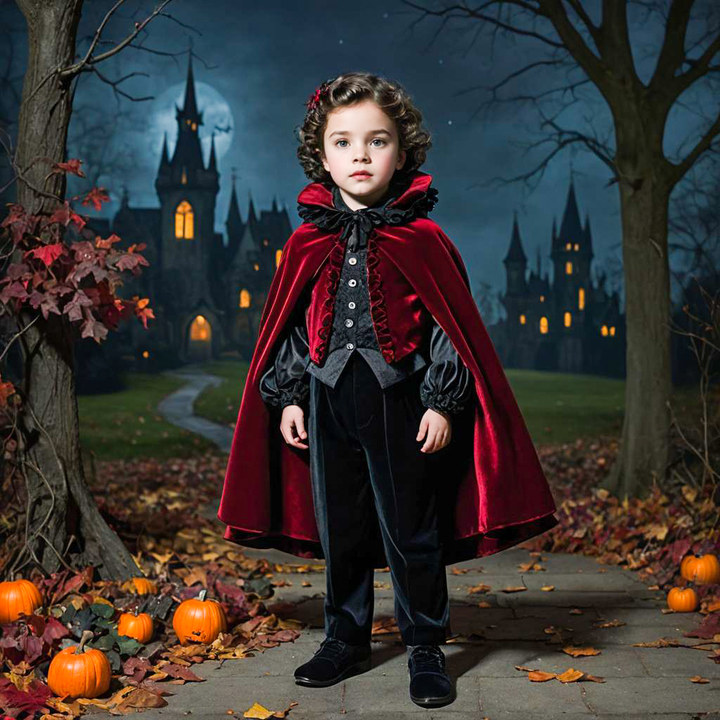 Young child dressed in a mischievous vampire Halloween outfit, featuring a deep red velvet cape with a ruffled collar and matching bonnet, paired with a black velvet shirt with ruffled cuffs and charcoal pants. The setting is a spooky nighttime scene with fallen autumn leaves on the ground, a full moon in the sky, and a gothic, illuminated mansion in the background.