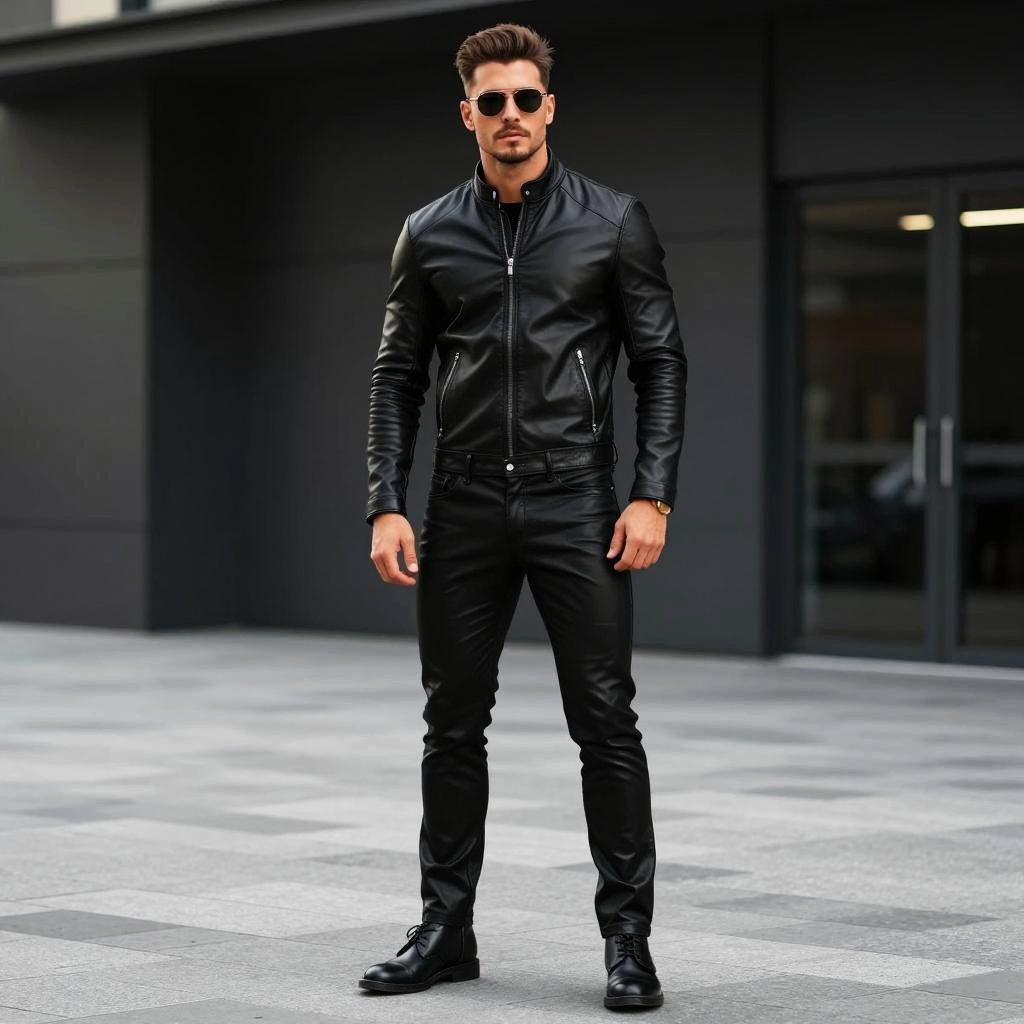 A stylish man stands confidently in a trendy urban setting, showcasing his edgy look with a black leather jacket adorned with patches. His modern outfit, paired with a casual white t-shirt, reflects the bold fashion statements of contemporary street style.