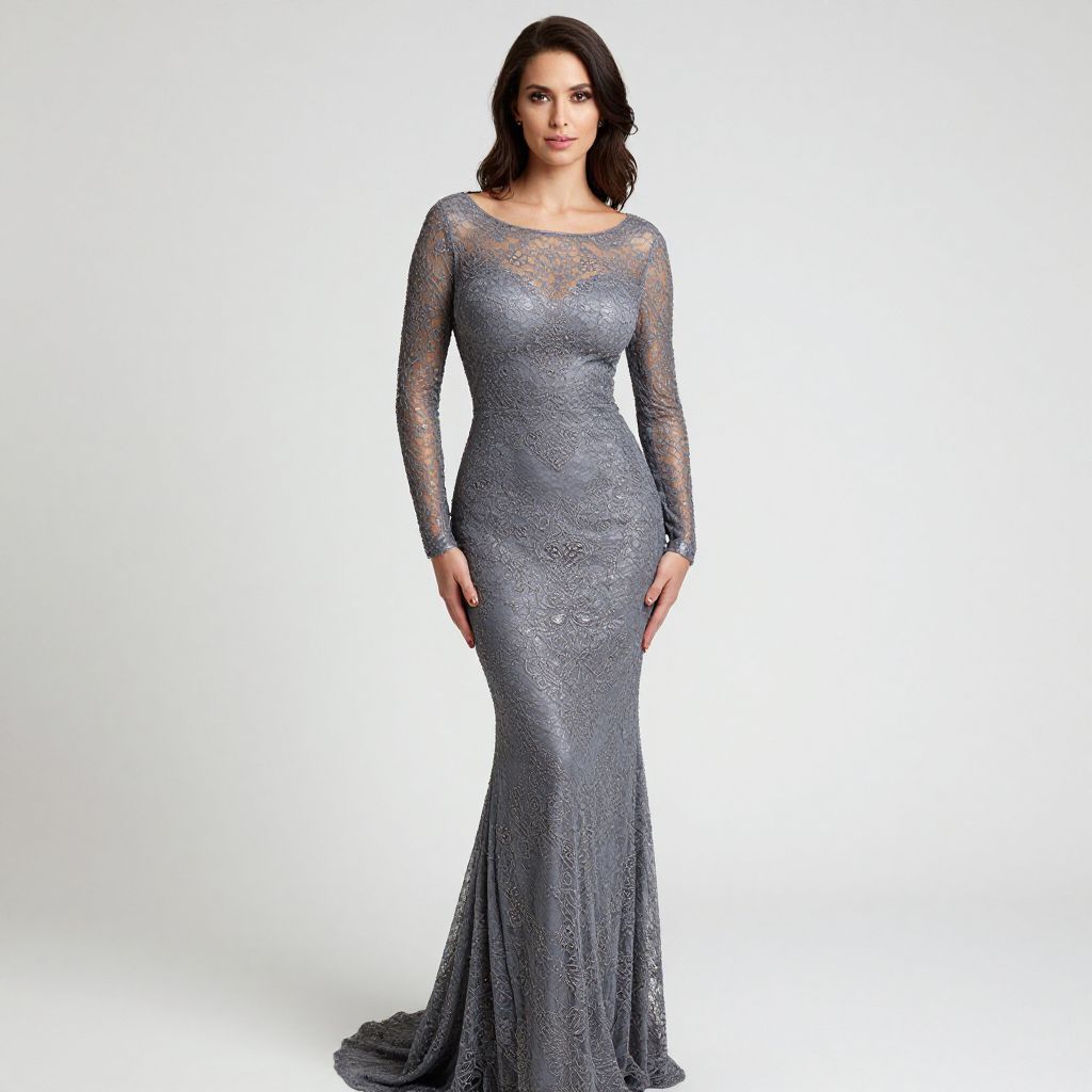 "Woman, elegant evening wear, lace-embellished gown in silver-gray, boat neckline, long fitted sleeves, form-fitting silhouette, mermaid-style skirt with a slight flare at the hem, intricate beaded details throughout, plain white background.. Sexy. Pretty face and beаutiful eyes. Big breasts."