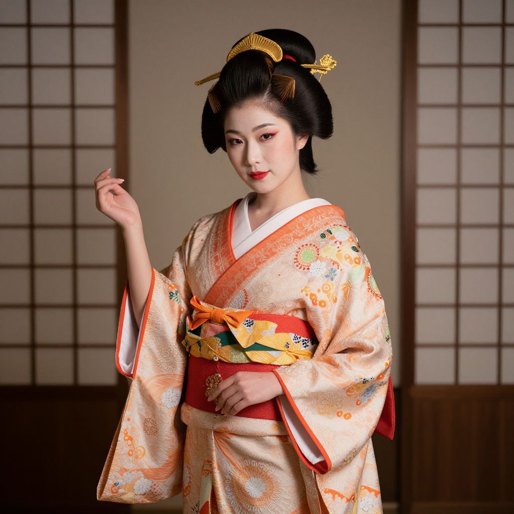 Photograph of an elegant Japanese woman in traditional attire, standing against a backdrop of shoji screens. She has fair skin, black hair styled in an elaborate updo adorned with gold hairpins. She wears a beige kimono with orange and floral patterns, accented by an orange obi belt with gold details. Her makeup is subtle yet refined, featuring red lipstick. Her right hand is raised gracefully, while her left hand rests on her obi. The kimono's fabric has a smooth, slightly glossy texture. The background is softly lit, emphasizing her poised and dignified presence.
