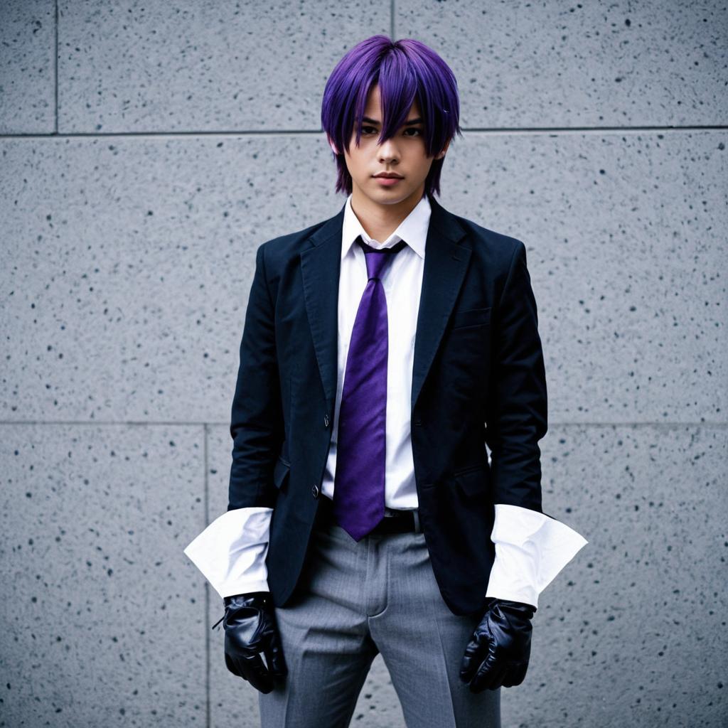 Portrait of a male cosplayer dressed as Tsugikuni Yoriichi with vibrant purple hair, wearing a black jacket over a white collared shirt with oversized cuffs, a purple necktie, grey pants, and black fingerless gloves, standing against a speckled grey concrete wall background.