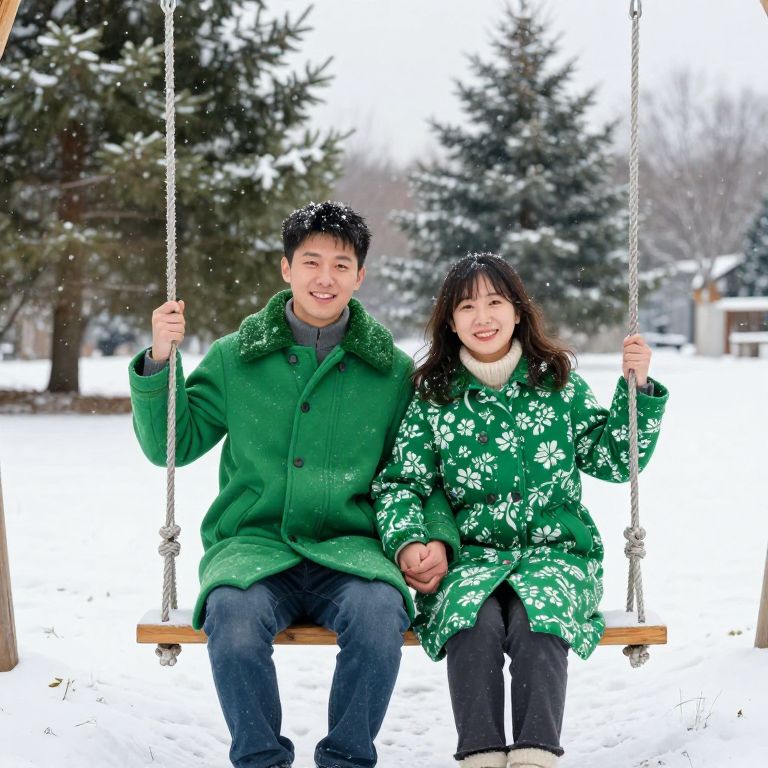 Photograph of an Asian couple sitting on a wooden swing in a snowy park. The man, with short black hair, wears a green parka and blue jeans, smiling warmly. The woman, with long black hair and bangs, wears a green winter coat with white snowflake patterns and black pants. Both hold the swing's ropes. Snow-covered trees and a white, snowy background are visible. The couple's joyous expressions and matching green winter attire contrast with the wintry scenery.