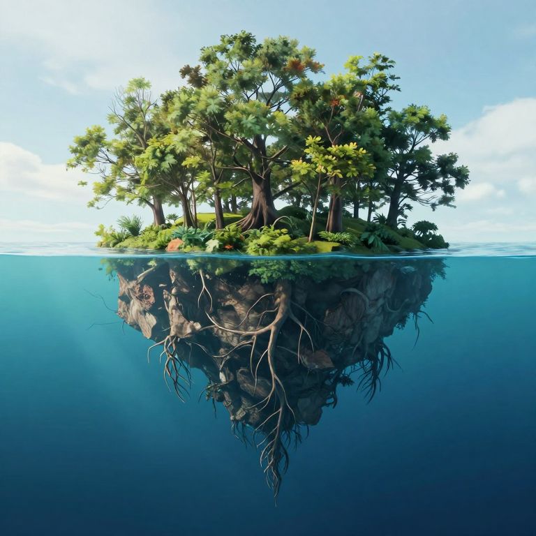 This is a digital artwork depicting a small, lush island with dense, green trees and shrubs, floating on a calm, blue ocean. Above the waterline, the island is bright with sunlight, while below, the clear water reveals the island's detailed reflection, showing exposed roots and rocky foundations. The sky is clear and blue, enhancing the vibrant greenery. The trees have thick trunks and a mix of leaf types, with some yellow flowers. The overall style is realistic, with sharp details and vivid colors, creating a surreal, floating-island effect.