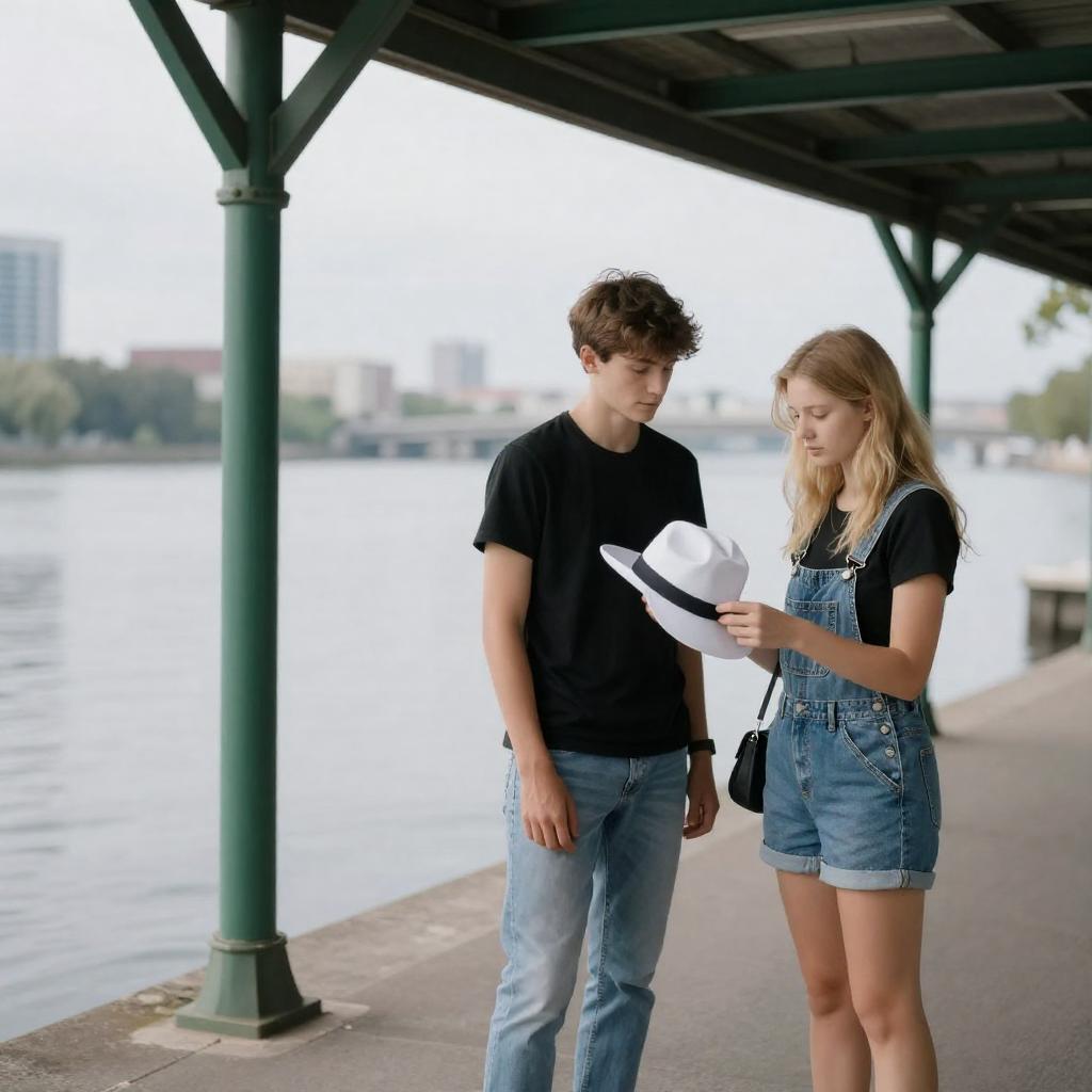 Photograph of a young couple standing on a waterfront pier. The boy, with short brown hair, wears a black t-shirt and blue jeans, looking at the girl. She, with long blonde hair, wears denim overalls and a black t-shirt, examining a white hat. They stand under a green, metal pier structure with a river and cityscape in the background.