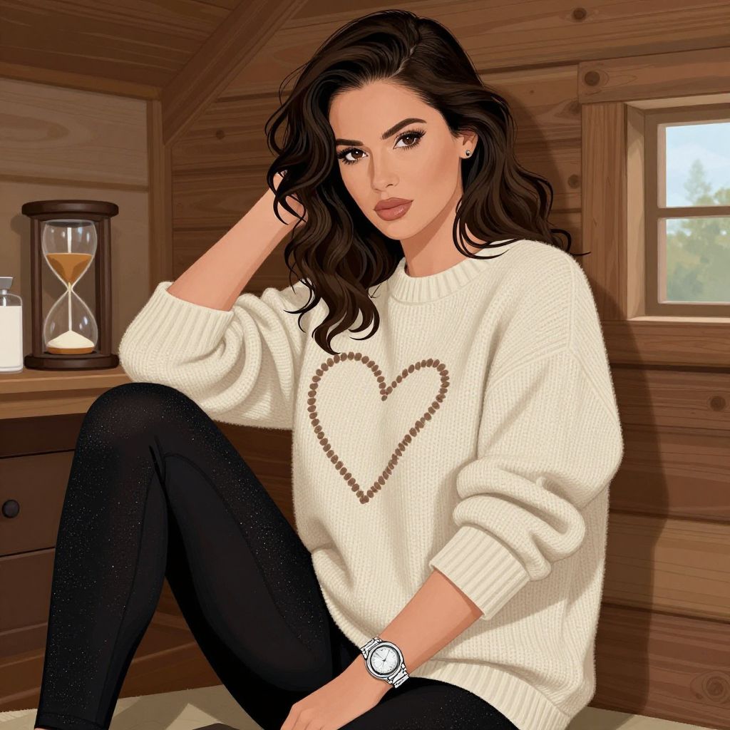 A Hourglass woman in a cozy cabin, dressed in an oversized cream sweater with a heart design and sparkling black leggings, accessorized with a silver wristwatch and wavy hair, illustrated in the style of IDW Publishing. Sexy. Pretty face and beutiful eyes Sexy. Pretty face and beаutiful eyes. Big breasts