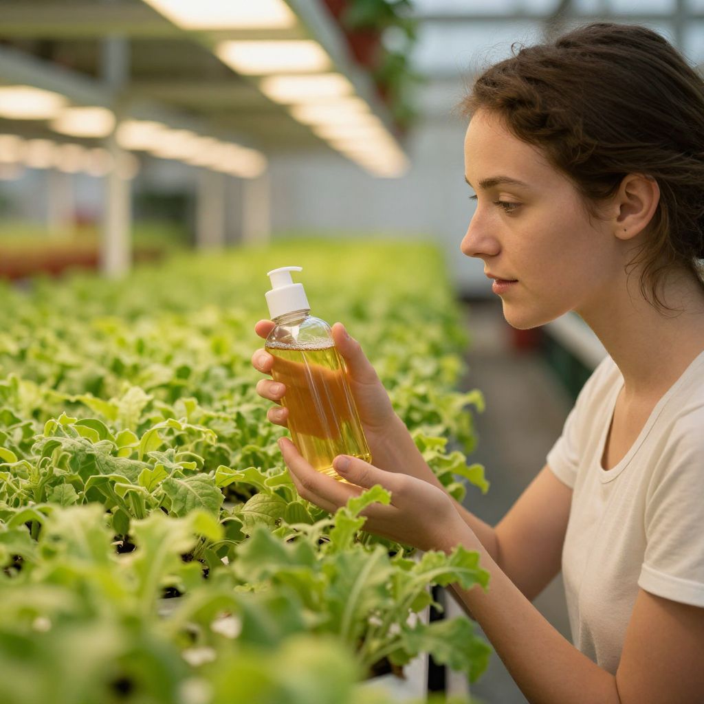Woman nurturing vibrant green plants in a hydroponic farm, holding a transparent bottle filled with golden liquid, surrounded by rows of lush foliage and warm ambient lighting.