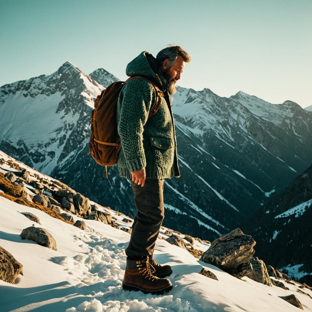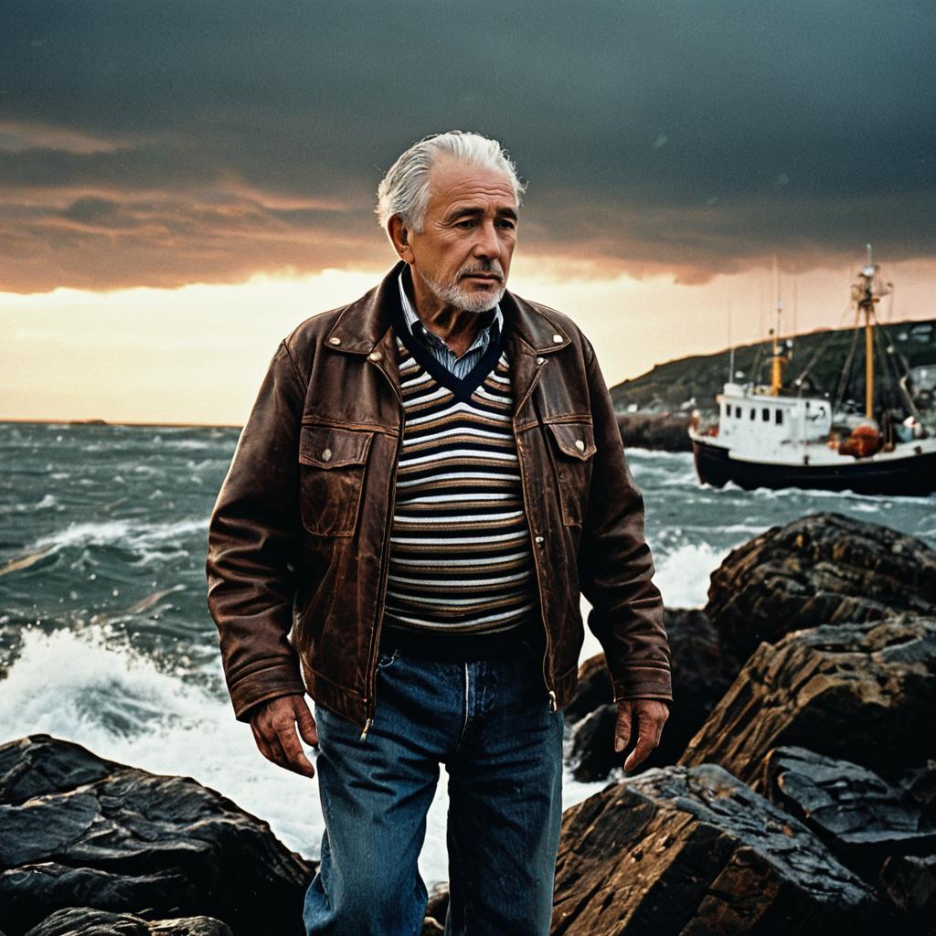 A weather-beaten dockworker in a stormy coastal village pier, wearing weathered brown leather jacket with brass buttons, faded gray woolen hat, and dark navy waterproof trousers, captured in a cinematic wide shot with soft golden hour lighting and high-fidelity detail ––sref 1562