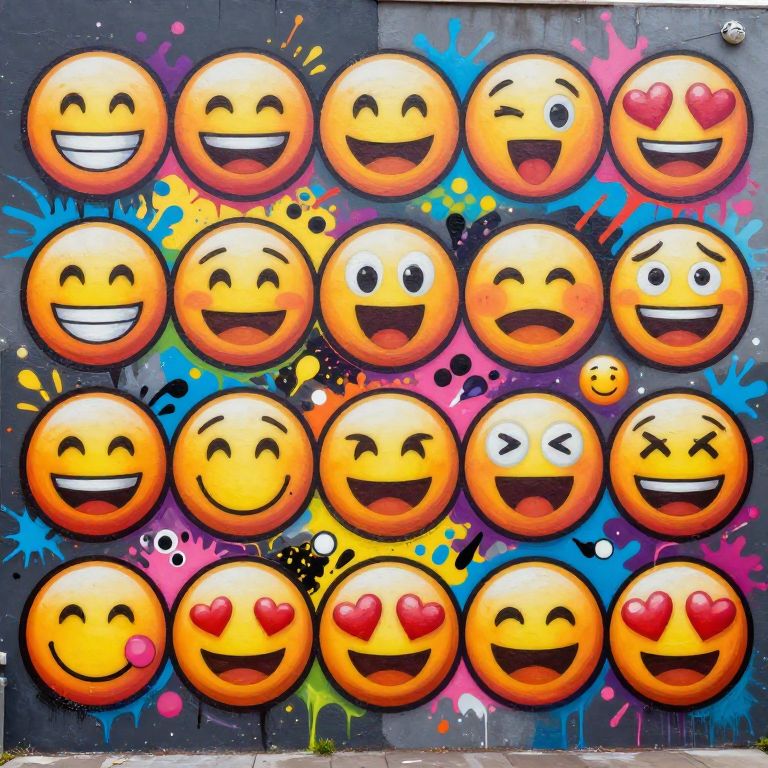Emojis free set in a lively urban mural style, street art inspired designs with bold outlines and vibrant paint splashes, diverse emojis showcasing happiness, surprise and love, energetic and creative vibe, high detail
