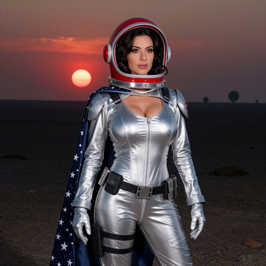 A natural, outdoor scene photograph of a woman in her 30s with dark wavy hair and hazel eyes, wearing a cosplay costume as a space explorer. The costume includes a reflective silver bodysuit with a red helmet, a utility belt, and a star-patterned cape. She stands on a rocky lunar landscape at twilight, with a glowing red sun behind her and distant craters in the distance.. The woman has big tits and cute face