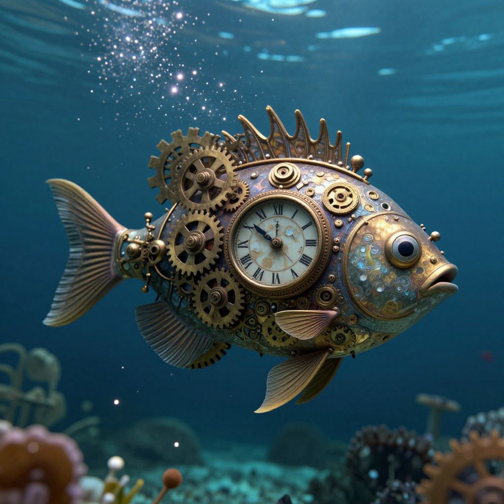 A steampunk-inspired 3D render depicts a clockwork fish adorned with intricate gears and Roman numeral clocks, gracefully swimming through a deep-sea environment illuminated by ethereal stardust particles, evoking a blend of vintage craftsmanship and otherworldly wonder.