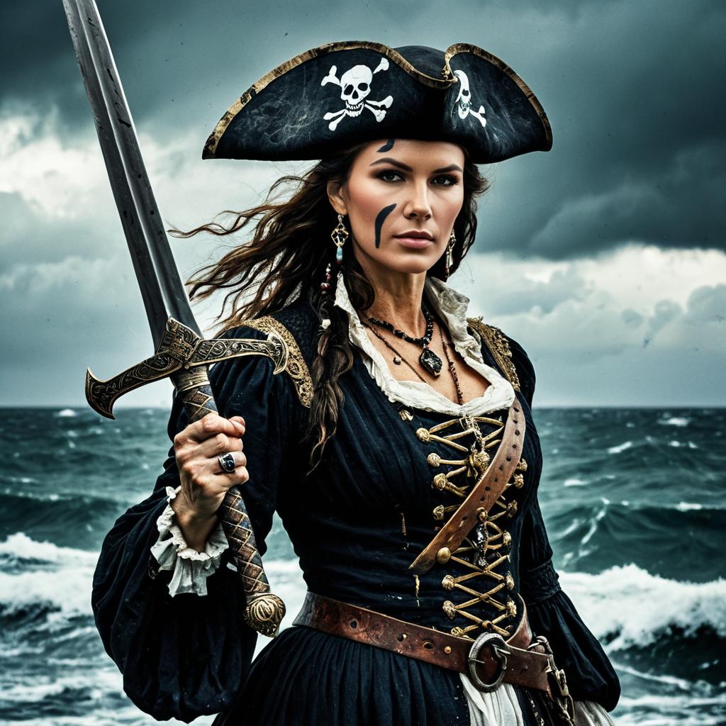 Time-worn pirate queen portrait with weathered scars, holding a jeweled cutlass. Set against a stormy sea background, this highly detailed fantasy piece draws influence from Howard Pyle, Нatan Eero Räisänen.