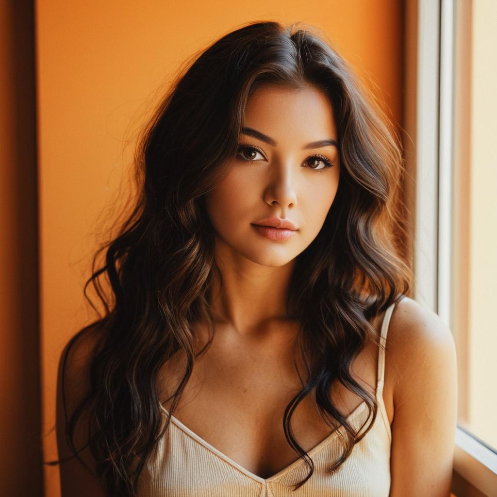A realistic portrait of a young woman with long wavy dark brown hair, smooth skin, wearing a light beige spaghetti strap top, warm soft natural lighting from window, warm orange background, detailed face, expressive eyes, subtle makeup, photographic style