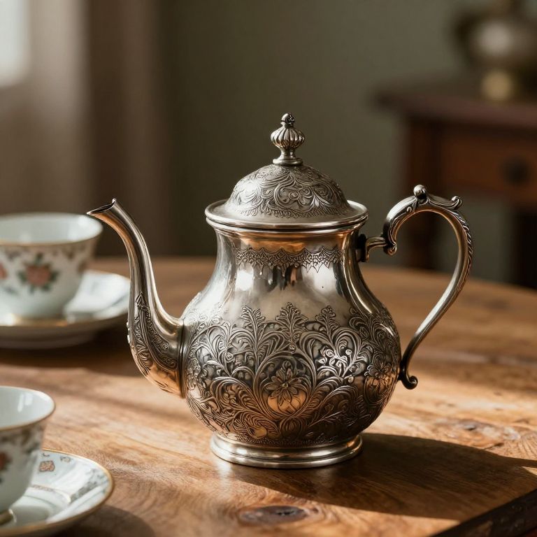 Ornate antique silver teapot featuring intricate filigree and lace-like engravings, placed on a rustic wooden table. The teapot has a decorative handle and spout, complemented by fine porcelain teacups in the background. Warm afternoon light casts gentle shadows, enhancing the vintage and cozy atmosphere.
