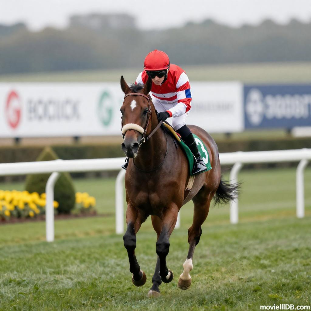 Photograph of a jockey in a red and white racing silks with a red helmet riding a brown horse with a green saddlecloth numbered 3. The horse is mid-stride on a grassy racetrack with blurred advertising banners in the background. The jockey's face is focused. The background includes greenery and yellow flowers. The image has a "MovielillDB.com" in the bottom right corner.