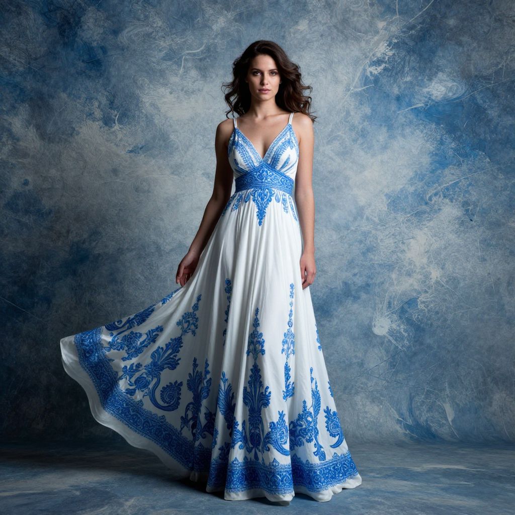 The image depicts a woman in a flowing, white dress with intricate blue patterns, standing against a backdrop of swirling blue and white textures. The dress is detailed with a V-neckline and thin straps, accentuating the elegance and grace of the figure. The woman's hair is styled in loose waves, adding to the overall lush and atmospheric feel of the scene. The interplay of light and shadow creates a sense of depth and dimension, highlighting the textures and contours of the dress and the woman's form. The background, with its dynamic and fluid blue and white splashes, enhances the emotive quality of the image, suggesting movement and a sense of being caught in a moment of time. The composition is balanced, with the woman positioned centrally, drawing the viewer's attention to her and the intricate details of her attire. The overall effect is one of beauty, elegance, and a sense of being immersed in a rich, textured world.