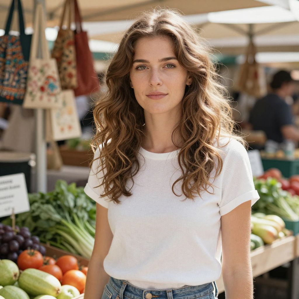 Photograph of a young woman with medium-length brown hair, wearing a blue denim jacket and matching jeans, standing in a sunlit outdoor market. She has a brown leather backpack and sunglasses on her head. The market, with colorful flags overhead, is lined with stalls displaying fresh fruits, vegetables, and clothes. The background shows vendors and shoppers, with sunlight casting shadows on the paved pathway. The woman stands slightly off-center, looking directly at the camera, exuding a casual, confident demeanor. The image has a bright, vibrant color palette.