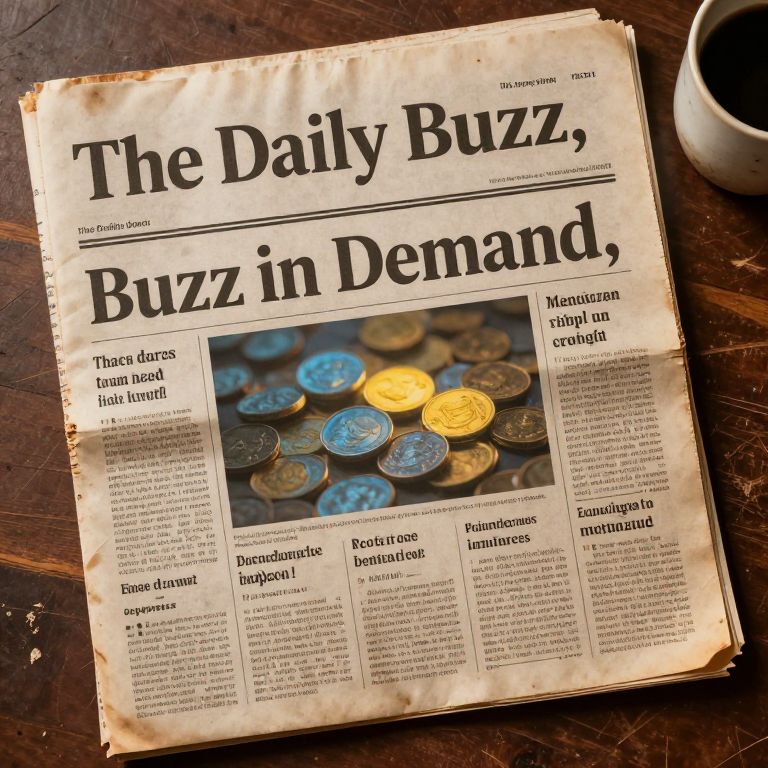 An overhead shot of an old, yellowed newspaper with a vintage aesthetic, titled 'The Daily Buzz, ' The headline in bold letters reads: 'Buzz in Demand, ' The front page is filled with several buzz-related stories, each in smaller columns and faded black ink, showcasing a variety of playful headlines and short blurbs, Prominently displayed on the front page is a picture of blue and yellow coins, glowing faintly to emphasize their importance in the stories, The newspaper texture appears slightly wrinkled and aged, with coffee stains and faint creases on the corners, The background is a wooden table with scratches and an old coffee cup sitting nearby for added realism, The lighting is warm, casting soft shadows, enhancing the nostalgic atmosphere