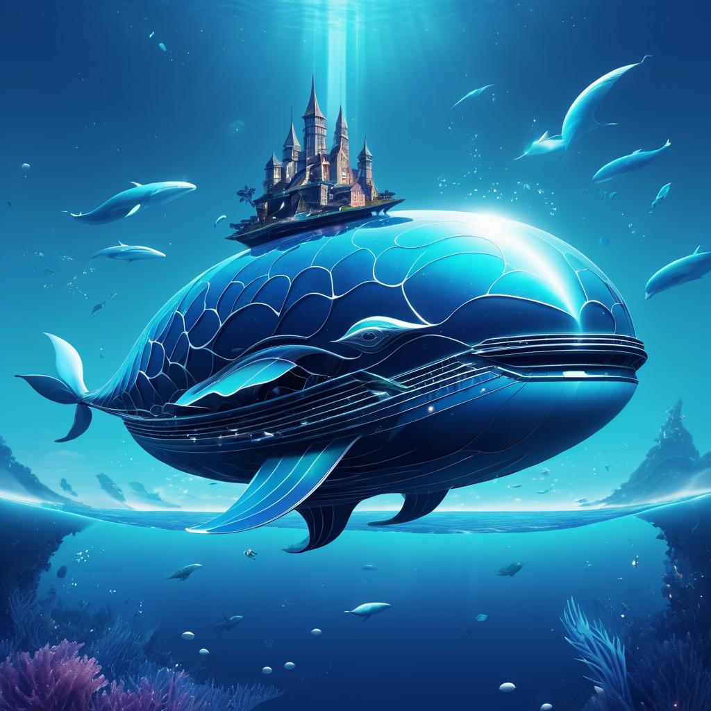 A floating whale, fantasy illustration with a surreal and futuristic design.