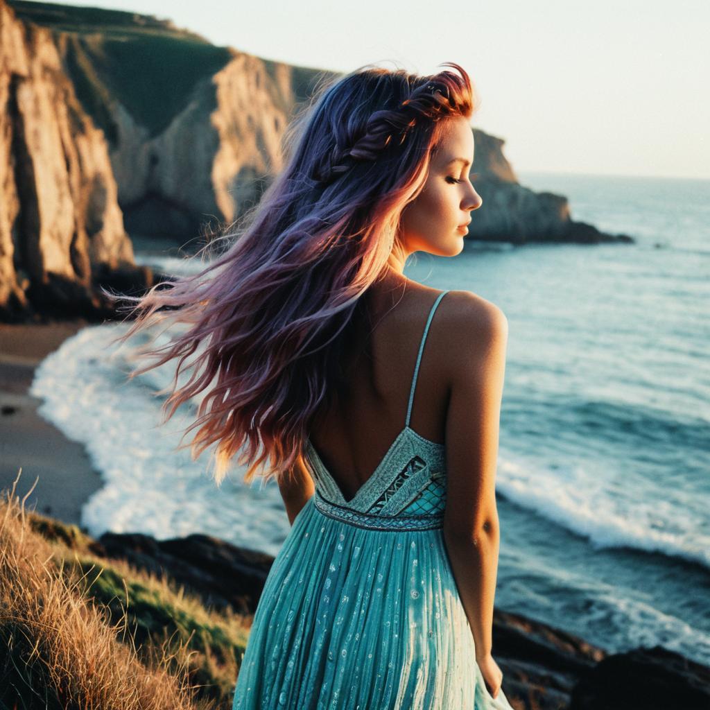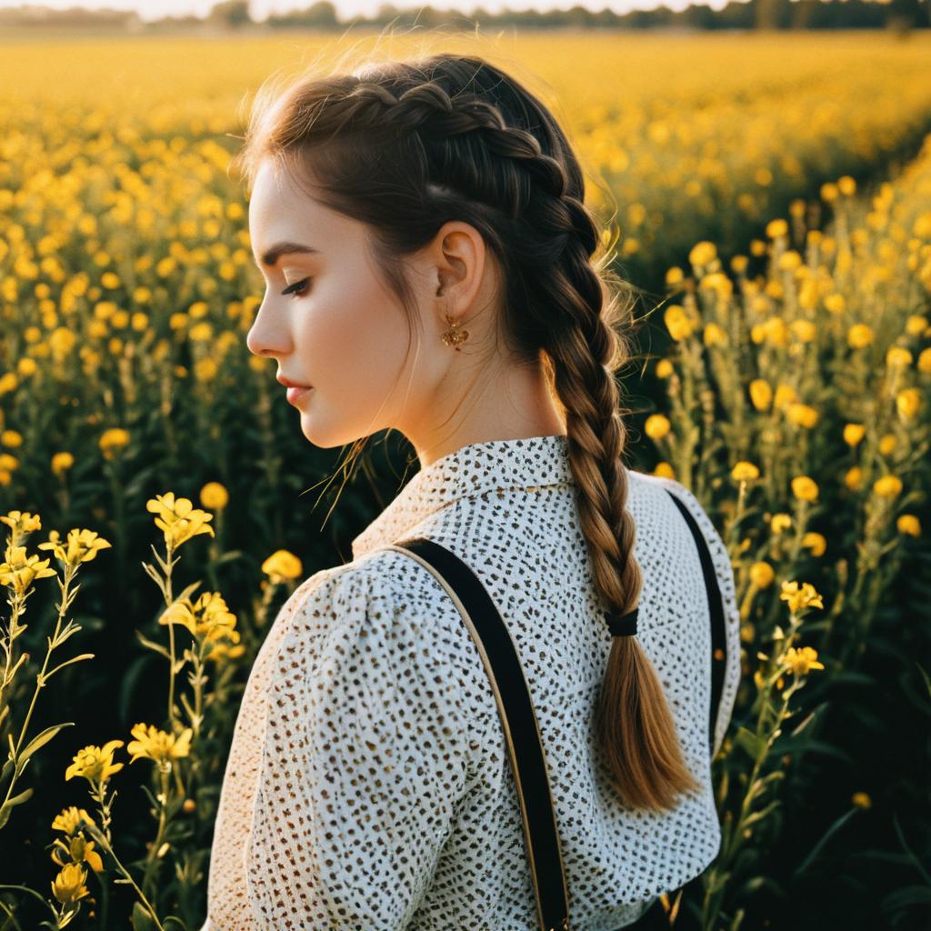 Halo Braid hairstyle on fashion model, wearing bright red satin dress, in outdoor field, captured in fashion editorial style with ethereal light.