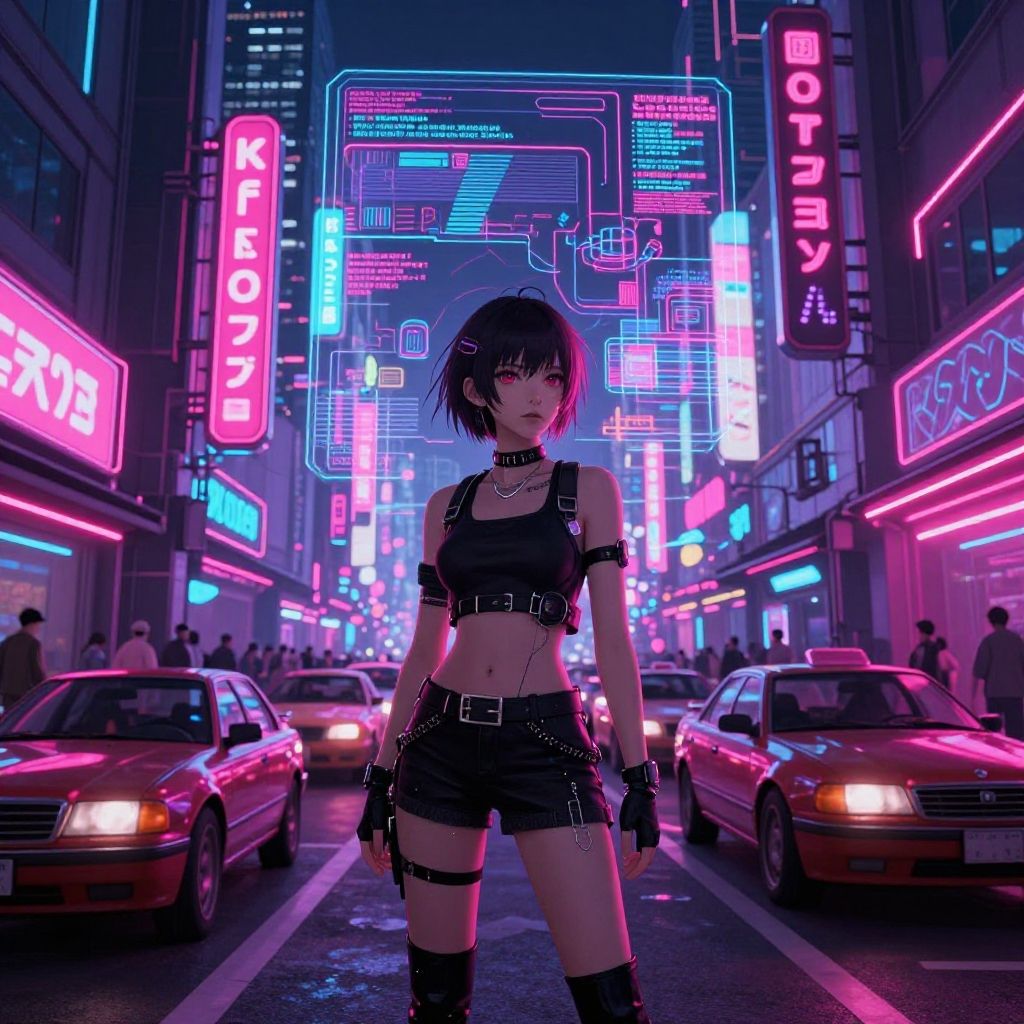 Neon-lit cyberpunk city street at night, featuring a goth girl in black leather outfit, short dark hair, standing confidently in front of