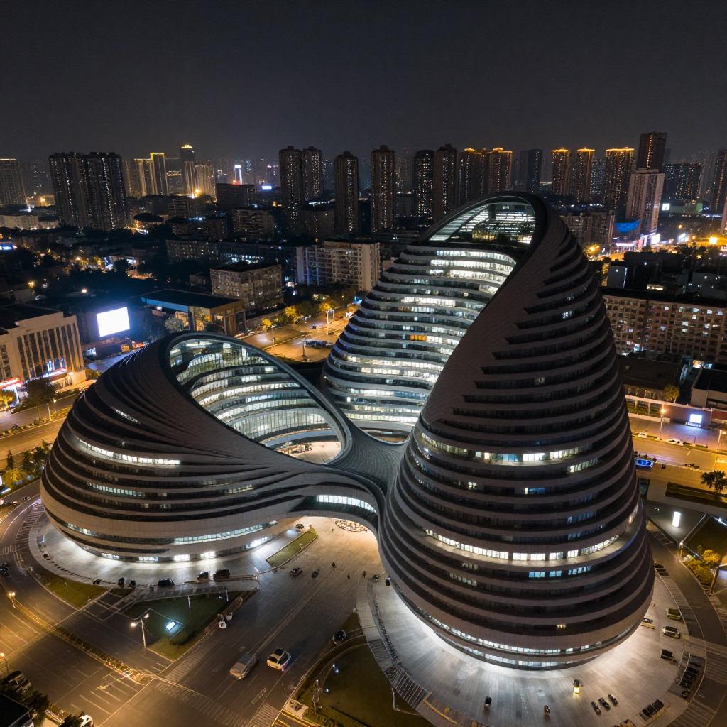Archiaerialview, architecture, night, curve, masterpiece, best quality, super detailed, realistic, photorealistic, 8k, sharp focus