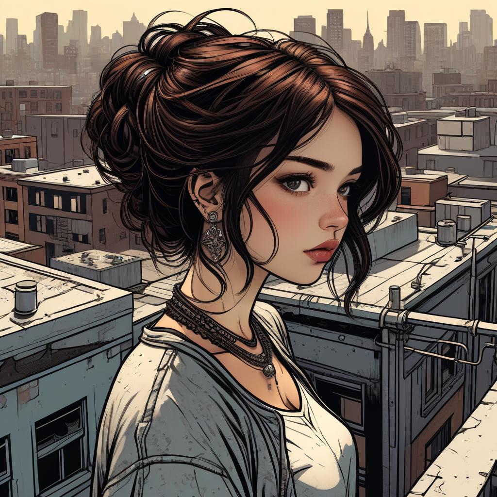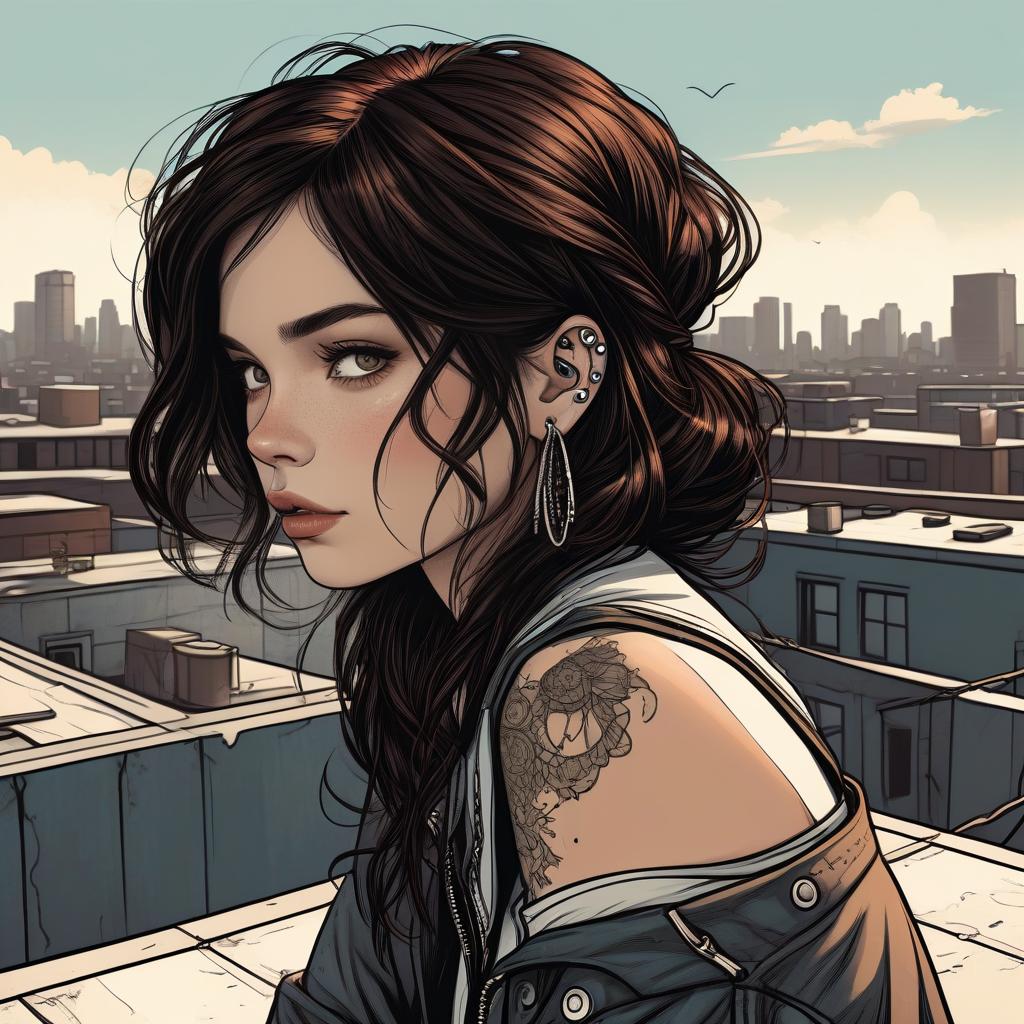 Dark brown hair, multiple piercings, illustration, rooftop, detailed, neutral tones, dramatic, graphic novel illustration, 2d shaded retro comic book