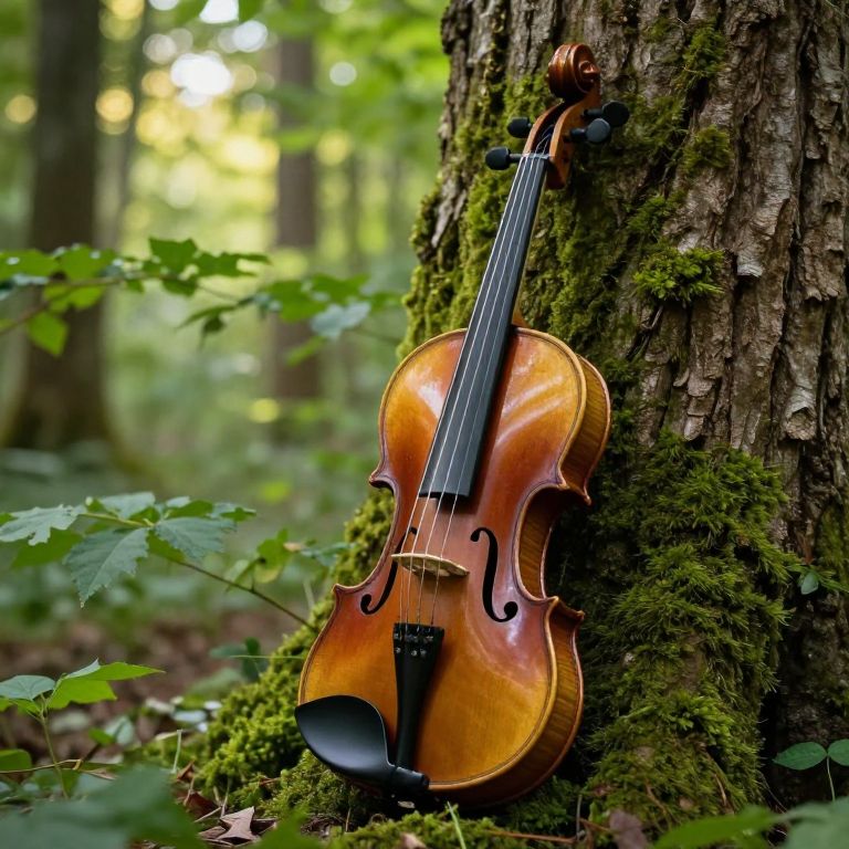 Violin resting gracefully against a moss-covered tree trunk, surrounded by vibrant green foliage and bathed in soft sunlight filtering through the forest canopy.