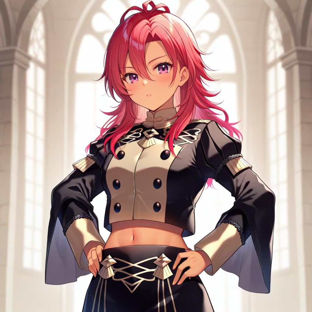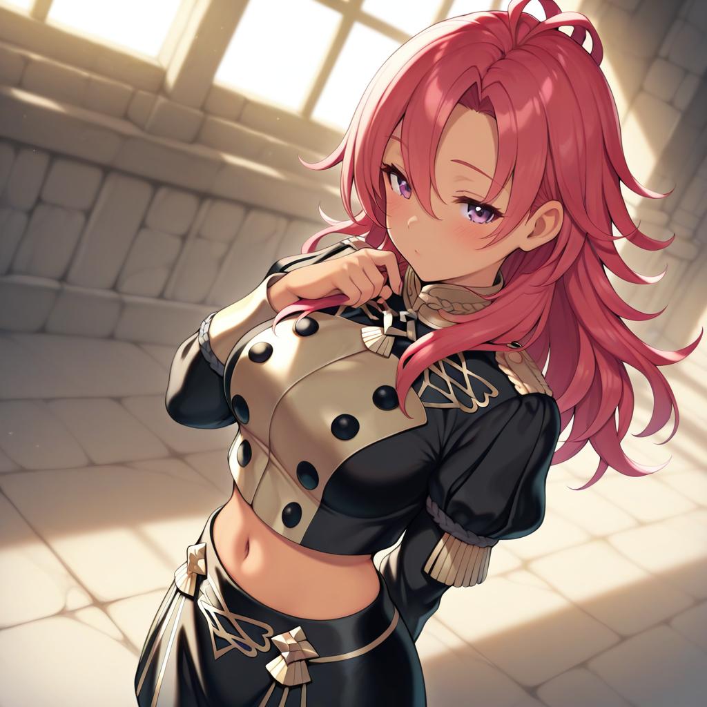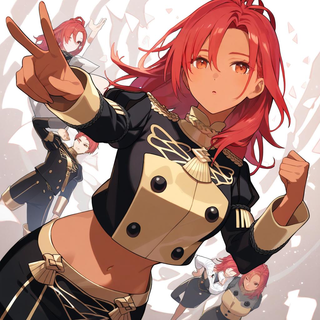 Hapi (fire emblem), fire emblem, 1girl, dark-skinned female, red eyes, red hair, long hair, navel, garreg mach monastery uniform, uniform, garreg mach monastery uniform, uniform, crop top, midriff, by artist jonylaser, illustrious