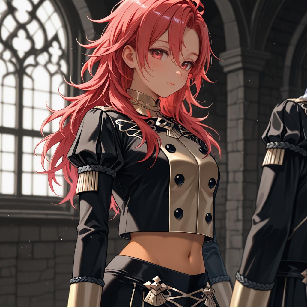 Illustration of a dark-skinned anime female character with long red hair and red eyes wearing a crop top version of the Garreg Mach Monastery uniform featuring black and beige tones, gold accents, and a midriff-baring design. The background shows stone archways typical of monastery architecture.