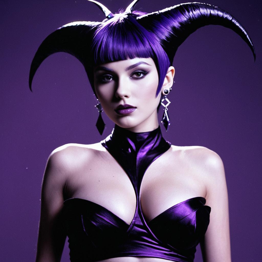 Yzma outfit,1girl, solo, purple hair, earrings, jewelry, breasts, short hair, navel, medium breasts, lips