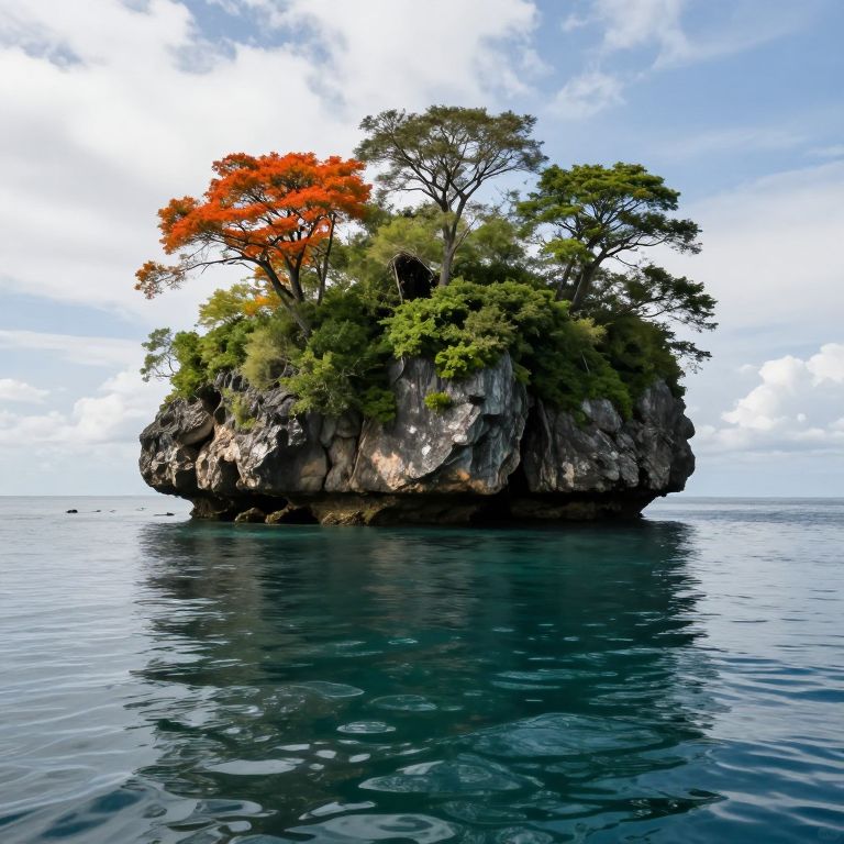 Rocky islet emerges from the tranquil ocean, crowned with lush greenery and three vibrant trees, its submerged base mirroring the surface above in a serene underwater reflection under a partly cloudy sky.