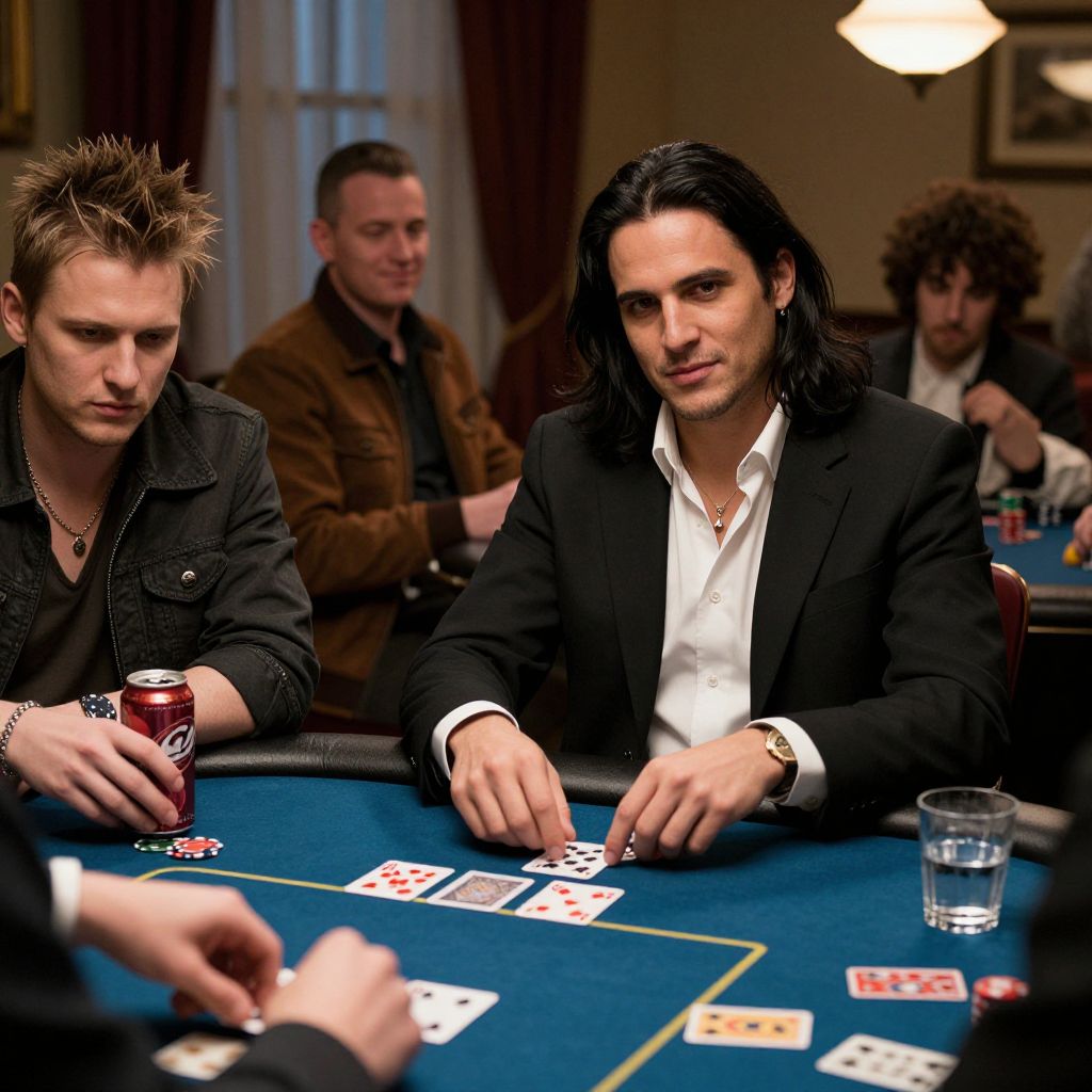 The image depicts a lively scene of four men engaged in a game of poker at a blue felt table. The central figure, a man with long, dark hair and a confident expression, is dressed in a black jacket over a white shirt, exuding an air of sophistication. To his left, a man with spiky hair and a serious demeanor is holding a can of \"Cranberry\" soda, while another man in a brown jacket looks on with a slight smile. In the background, a fourth man with curly hair is partially visible, adding to the dynamic atmosphere. The table is adorned with playing cards, dice, and a glass of water, suggesting an ongoing game. The background features a warm, dimly lit room with a window and a hanging light fixture, enhancing the cozy, intimate setting. The overall composition is rich with detail, from the textures of the clothing and table to the expressions and interactions of the characters, creating a vivid and engaging scene.
