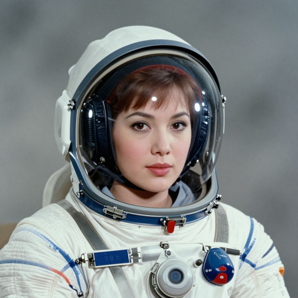 Award-Winning woman in space suit, close fitting, transparent visor, 1950s photograph, anime, cartoon, color, looking at the camera, desolate background, gray swirling dust,