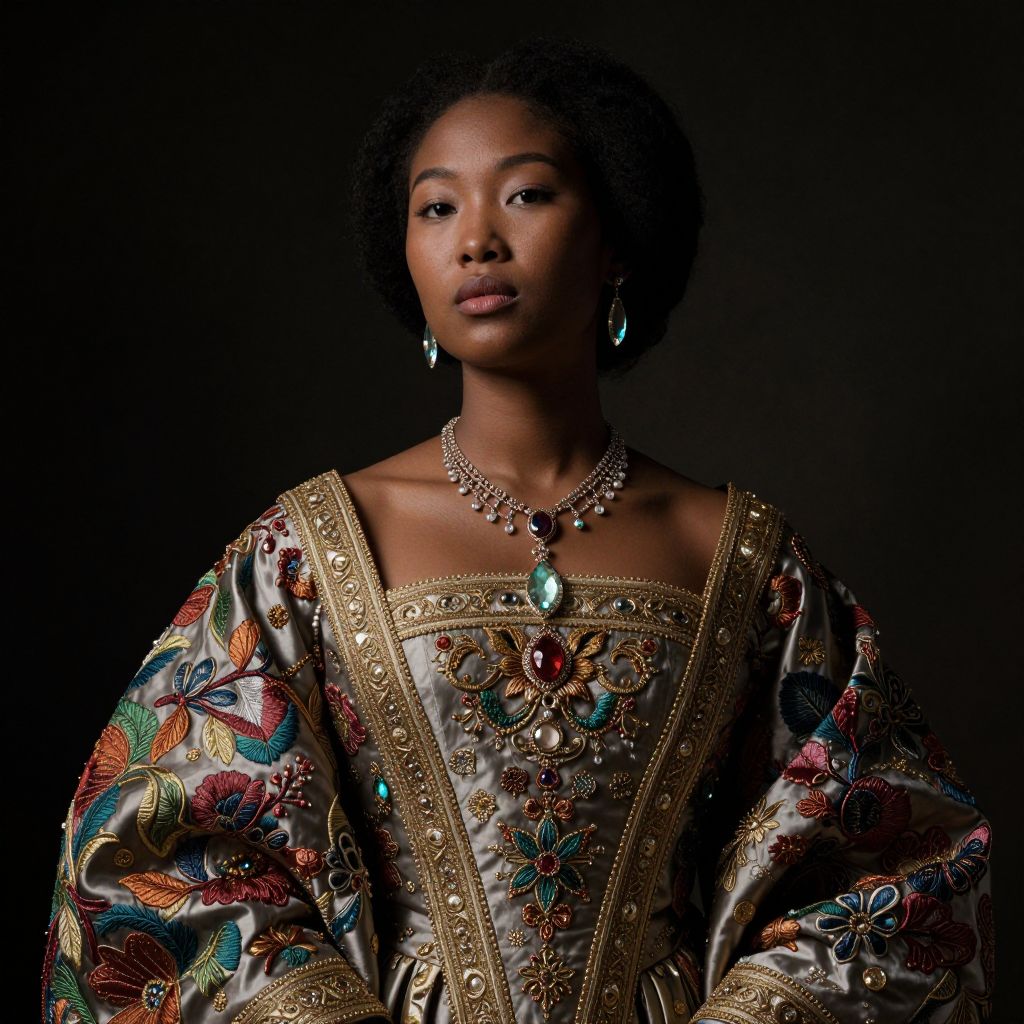 Render a photorealistic portrait inspired by high Renaissance artistry with a modern flair, showcasing an East Asian woman of African descent adorned in an intricately embroidered silk gown. Capture her from a low angle, emphasizing regal bearing and subtle features illuminated by interplay of light and shadow. Enhance the scene's ethereal elegance through digital art techniques, subtly glowing jewelry and accessories, creating a captivating emotional gradient that seamlessly blends historical grandeur with contemporary sensibilities.