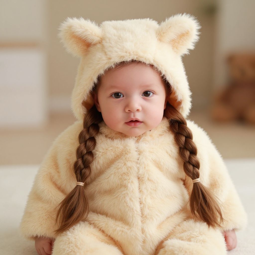 Photograph of a baby with fair skin, brown braided hair, wearing a fluffy, beige, bear-eared onesie, sitting indoors, looking