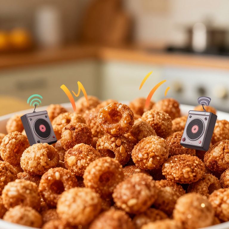 Close-up of Cinnamon Toast Crunch Remix cereal with a sparkling cinnamon sugar coating, animated remix elements like sound waves and DJ turntables integrated into the design, warm cozy kitchen lighting, rich textures and vibrant colors