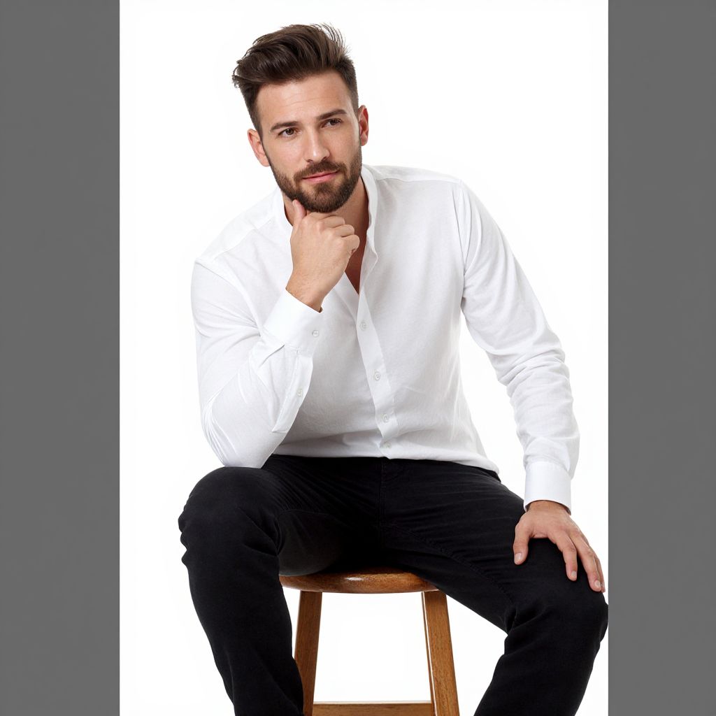 Photograph of a bearded man with dark brown hair, styled neatly, sitting on a wooden stool against a white background. He wears a crisp, white, long-sleeved button-up shirt and black jeans. His right hand rests on his chin thoughtfully, while his left hand is placed on his left thigh. The man has a fair skin tone and a slightly serious expression. The image is framed by a narrow gray border on both sides. The overall style is modern and professional.