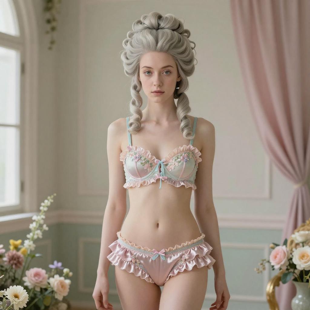 Image in the style of Rococo pastel glamour, playful aristocrat, powdered elaborate updo, frail slender, lingerie cut-out set, pastel embroidered bralette, silky ruffled panties, soft pastel garden room studio background