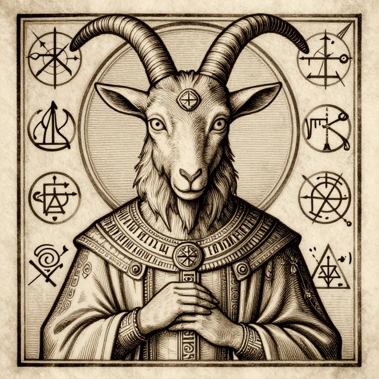 Baphemet portrait in a medieval grimoires style, sepia tones with intricate linework, goat-headed figure with piercing eyes and elaborate ceremonial robes, surrounded by alchemical symbols and arcane text, mysterious and ancient vibe