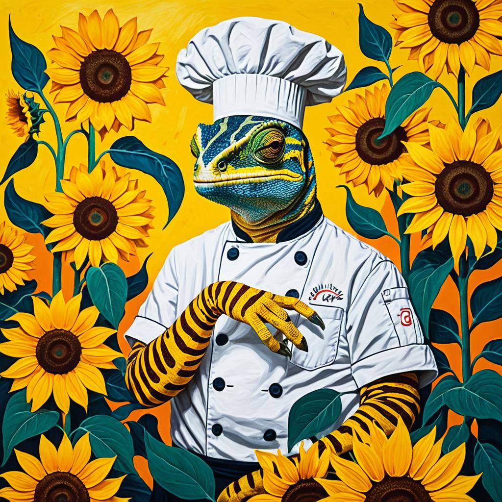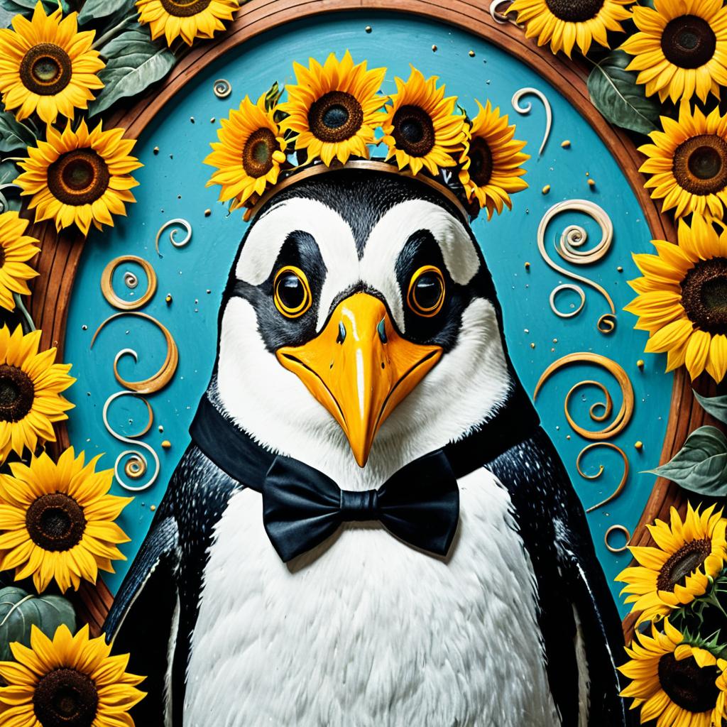 Create a humorous portrait of Professor Pufferfish inspired by Frida Kahlo, surrounded by sunflowers with swirling brushstrokes, vibrant colors, whimsical touch, sunflower crown, with a thoughtful expression