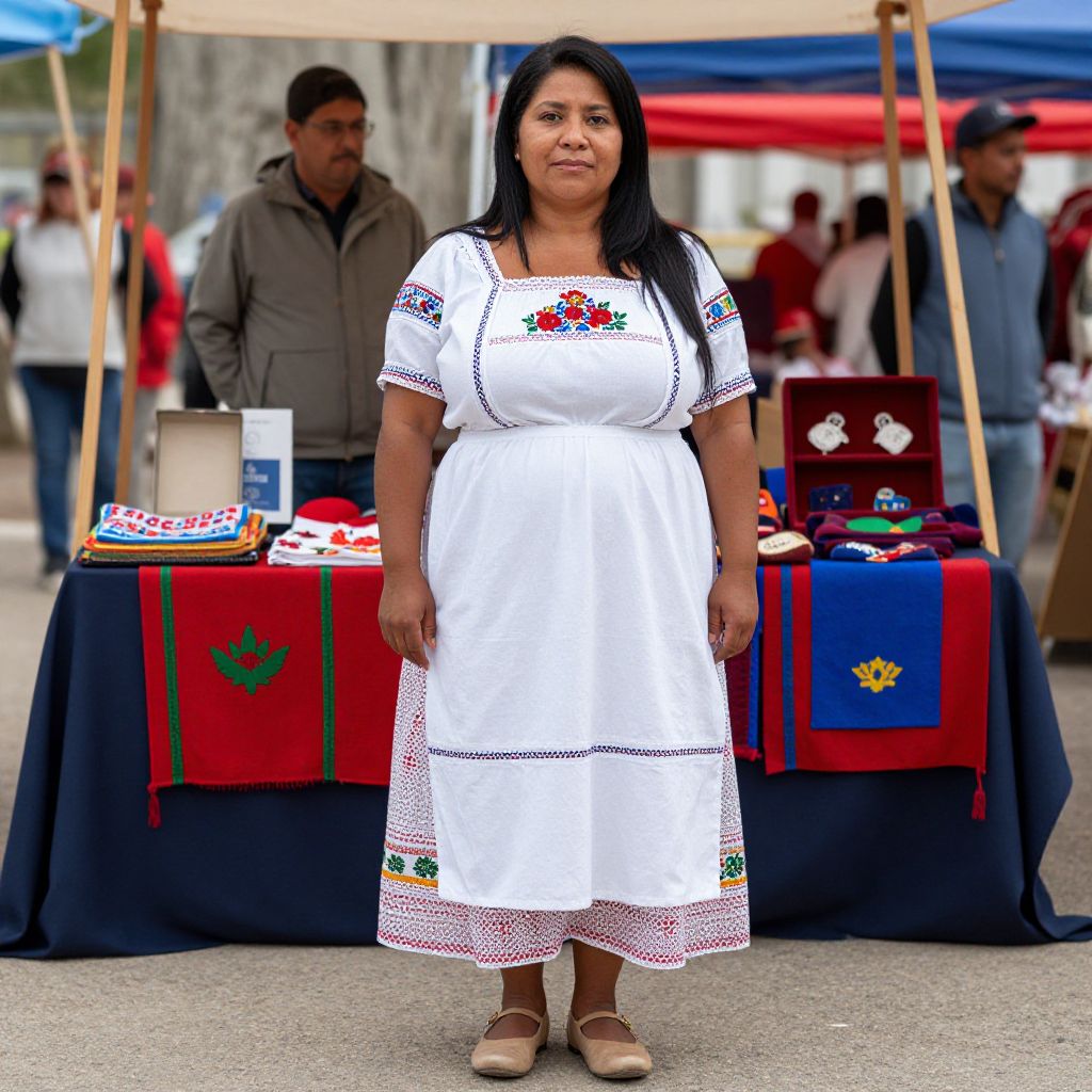 Photograph of a Latina woman with long black hair in a white embroidered dress, standing in front of a market stall with colorful textiles and crafts, outdoors