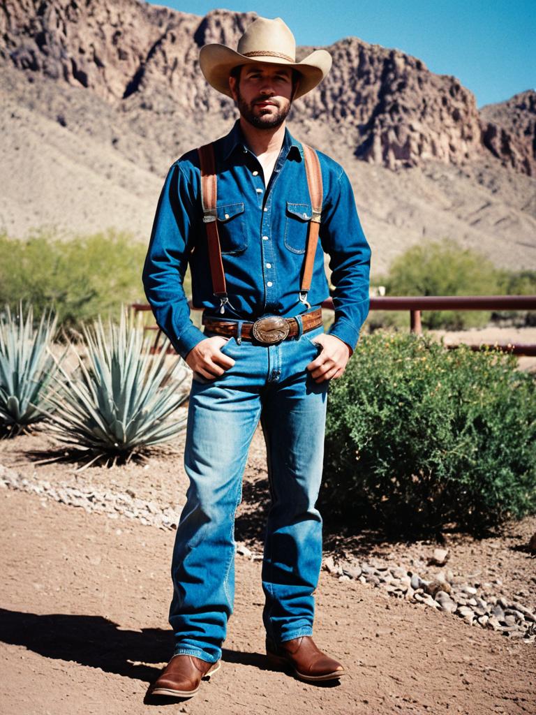 American costume las vegas, 1boy, male focus, solo, denim, hat, pants, shirt, belt, jeans, hands in pockets, brown footwear, standing, cowboy hat, jacket, full body, facial hair, blue shirt, brown belt, outdoors, suspenders, cowboy western